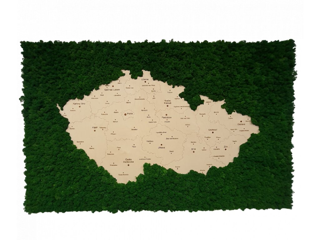 Stylový mechový obraz o celkovém rozměru 150x100 cm. Jedinečný, ručně zhotovený doplněk interiéru. Výplň obrazu tvoří zelený lišejník a dřevěná mapa České republiky. Obraz má na zadní straně kvalitní závěsný systém.