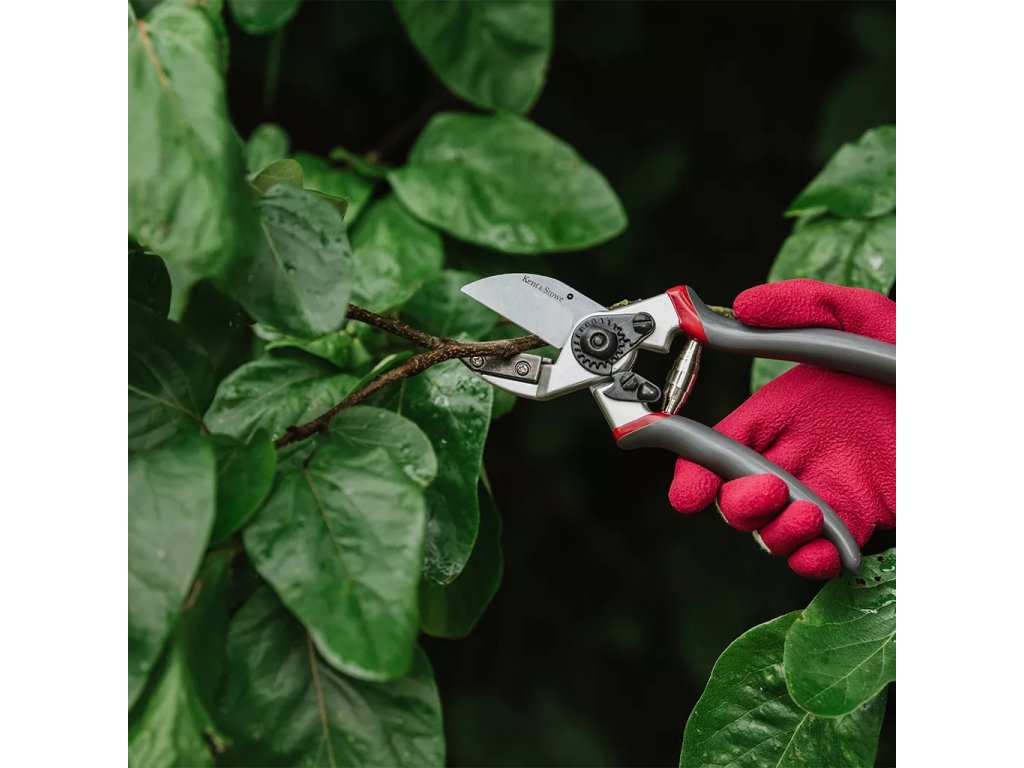 Profesionální zahradnické nůžky Kent & Stowe s vysoce kvalitní tepelně zpracovanou čepelí z uhlíkové oceli SK5. Obsahuje dvoupolohovou západku, která vám umožní upravit rozpětí rukojetí pro pohodlí při používání pro menší i větší ruce.